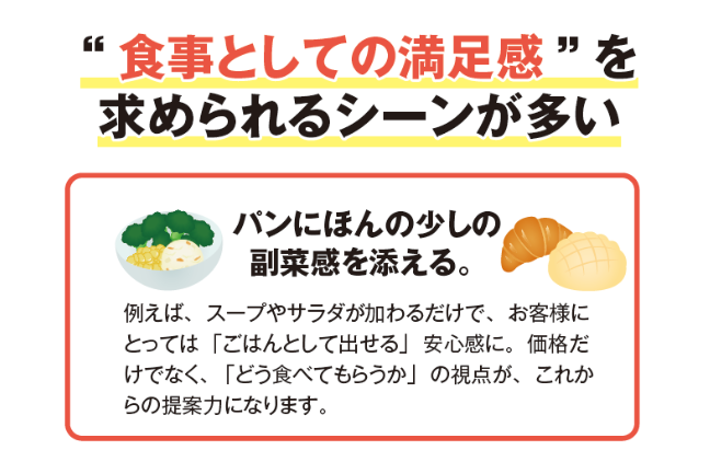 たとえば、「食事パン+カップ入りのミネストローネ」「フォカッチャ+惣菜サラダ」など、パンを一食として成立させる工夫。それが、主婦の「これだけで今日の夕飯になる」「選ばなくて済む」といった安心感につながり、あと一品の売上になる可能性を秘めています。