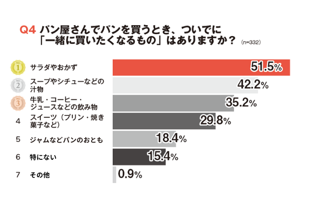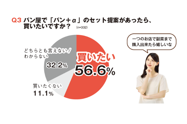 今回、主婦層を中心に332人へ行ったアンケートでは、53.9%が「パンだけでは家族に出しにくいと感じたことがある」と回答。背景には「パンだけでは栄養が偏る気がする」(69.3%)「主菜がないと食事として物足りない」(59.8%)といった声が多く、家庭でのきちんとごはんの一部としてパンを出すには、何かもう一品あることが安心感につながっているようです。こうした意識を受けて、「パン+α」のセット提案に対して56.6%が「買いたい」と前向きな回答をしているのも注目ポイント。実際に、パンと一緒に買いたくなるものとしては、「サラダやおかず」(51.5%)「スープやシチュー」(42.2%)「飲み物(牛乳・ジュースなど)」(35.2%)が上位に挙がり、食卓としての完成度を高めるものが求められていることが分かります。パン屋さんにとって「あと一品の提案」は、決して大げさなことではありません。