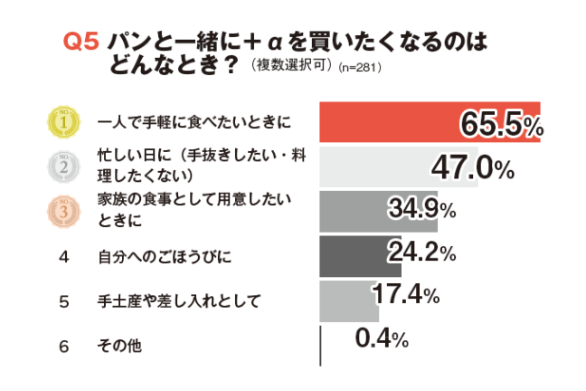 「パン+αが欲しくなるのは、どんなときですか?」という質問に対して、最も多かったのは意外にも「一人で手軽に食べたいとき」(65.5%)でした。次いで「忙しい日(47.0%)」「家族の食事として用意したいとき( 34.9%)」と続いています。