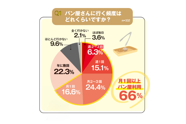 洋菓子屋さんに行く洋菓子好き消費者にパン屋さんに行く頻度を尋ねると66%が月1回以上パン屋さんに行くと答えました。