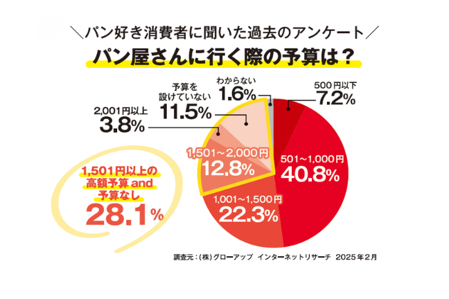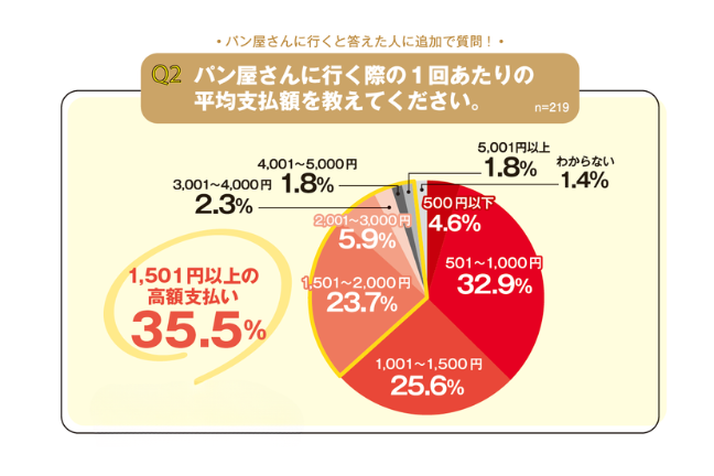 以前のパン好き消費者アンケートでパン屋さんに行く際の予算感を尋ねたことがあります。大体のボリュームゾーンは1000円前後なので、「1501円以上」と答えているのは高額な予算と考えられるでしょう。
