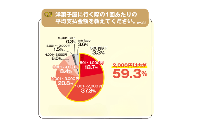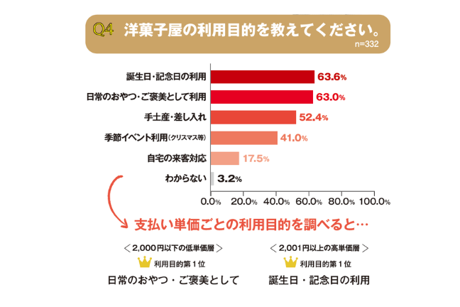 ということで一度の平均支払金額ごとに利用目的を調べたところ、2000円以下の手ごろな価格の消費者の利用目的1位が「日常のおやつ・ご褒美として利用」で、2001円〜の高単価層の利用目的1位が「誕生日・記念日の利用」でした。