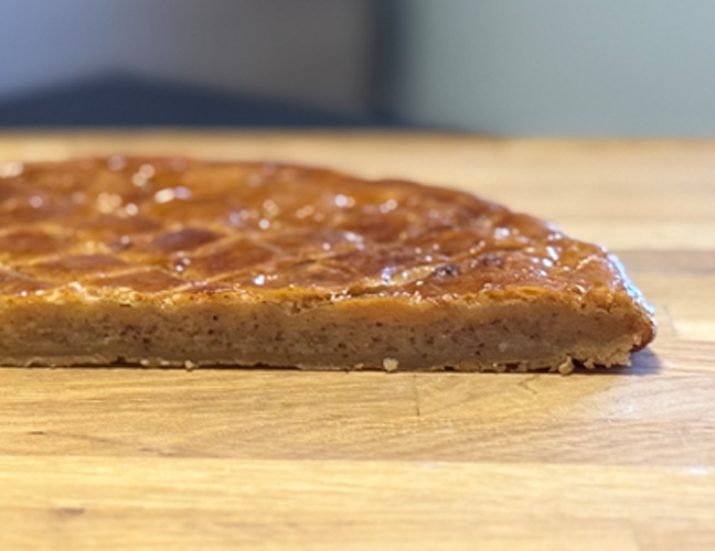 中身はと申しますと、普通のガレット・デ・ロワと同じフランジパーヌクリームです。ただ、外を覆っているペーストが生む「カリッ」と「サクッ」の中間くらいの食感と、香ばしく焼かれたアーモンドの香りでより一層美味しいんです。日本ではあまりというか全く見たことも聞いたこともないので、もし興味を持っていただけたのであれば、インターネットで【galette des rois hollandaise】と検索していただくと出てくるペーストのレシピ(フランス語ですが)と焼成時間などを参考に作って食べていただけたらと思います。